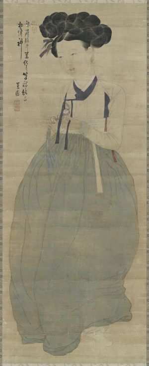 신윤복이 그린 전신 입상 형식의 미인도. 조선 시대 풍속화 중에서도 인물의 심리 묘사와 조형미가 정점에 달한 작품입니다. 제발에 적힌 문구는 화가가 대상을 바라보는 예술적 태도와 ‘전신(傳神, 정신을 전함)’의 미학을 담고 있습니다.