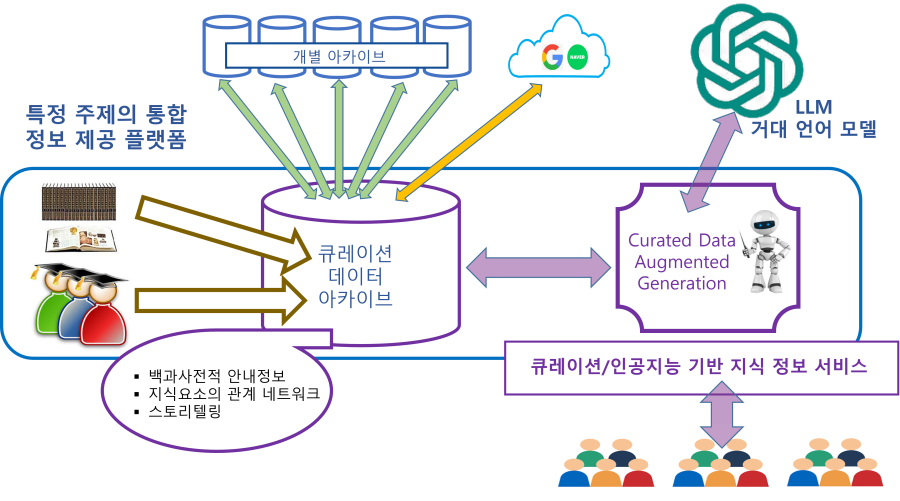 • 산재된 웹 아카이브 및 플랫폼의 데이터를 기계적으로 수집, 통합하는 방식이 아니라, 의미있는 지식 자원을 디지털 큐레이션 방식으로 해석·정리하여 "이해할 수 있는 콘텐츠"로 재구성합니다.